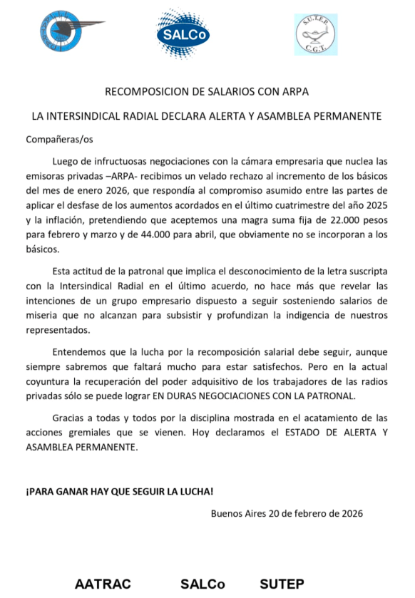 Se entregó un comunicado que anuncia que la Intersindical Radial -integrada por los gremios AATRAC, SALCO y SUTEP– se declara en estado de alerta y asamblea permanente en Argentina.