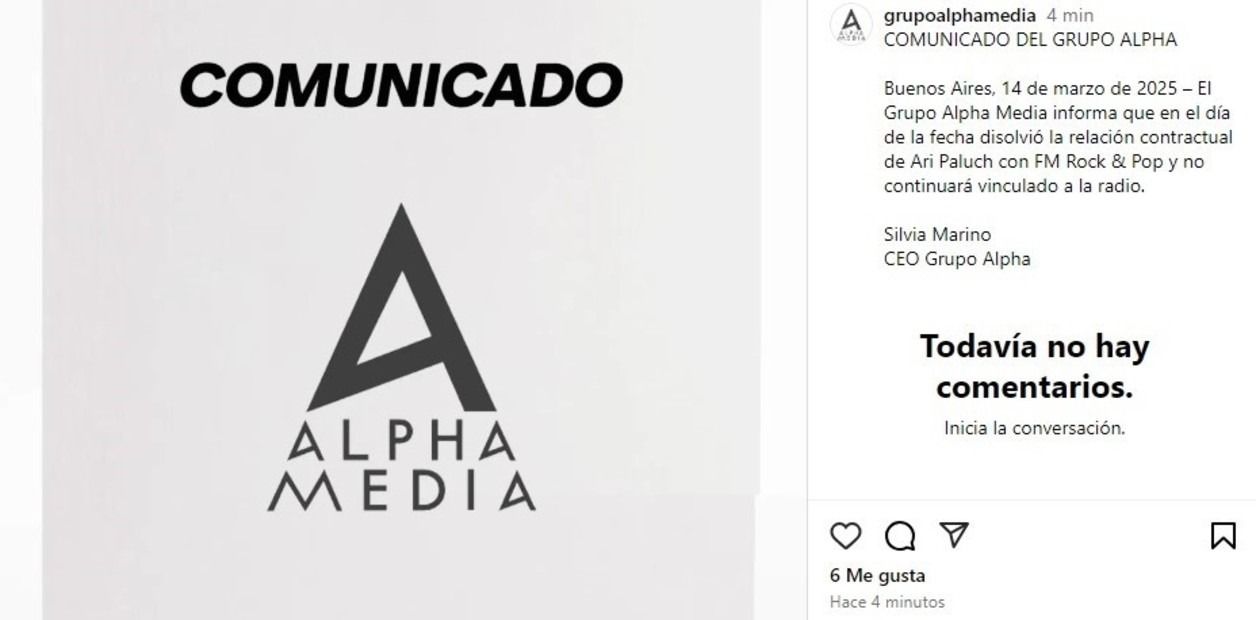 “Buenos Aires, 14 de marzo de 2025. El Grupo Alpha Media informa que en el día de la fecha resolvió la relación contractual de Ari Paluch con FM Rock & Pop y no continuará vinculado a la Radio. Silvia Marino, CEO Grupo Alpha”, decía la publicación en Instagram.