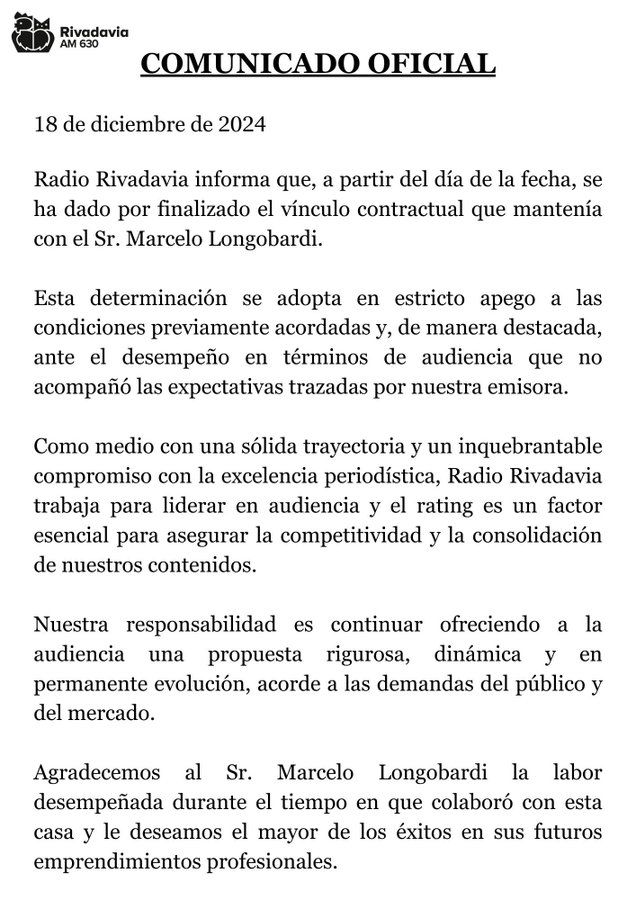 “Rechazo por improcedentes e intempestivos todos y cada uno de los términos de su Carta Documento 47542640 sellada el 17 de diciembre de 2024, por la cual se pretende infundadamente dar por terminada nuestra relación contractual. Como todos los días, mañana me conectaré para conducir mi programa de la misma manera en que lo he venido haciendo hasta ahora, en forma habitual. En caso de que Uds. me lo imposibiliten hago reserva de iniciar las acciones legales que correspondan. Ratificaré el contenido de este mensaje mediante formal carta documento”, respondió Longobardi.