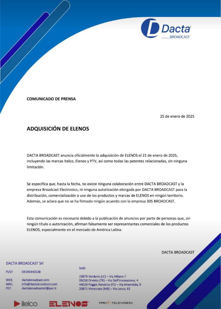 ESCUCHÁ LA NOTICIA ☝️ – Dacta Broadcast anunció oficialmente la adquisición de Elenos el 21 de enero de 2025, incluyendo las marcas Itelco, Elenos y PTV, así como todas las patentes relacionadas, sin ninguna limitación.