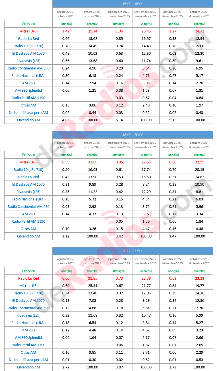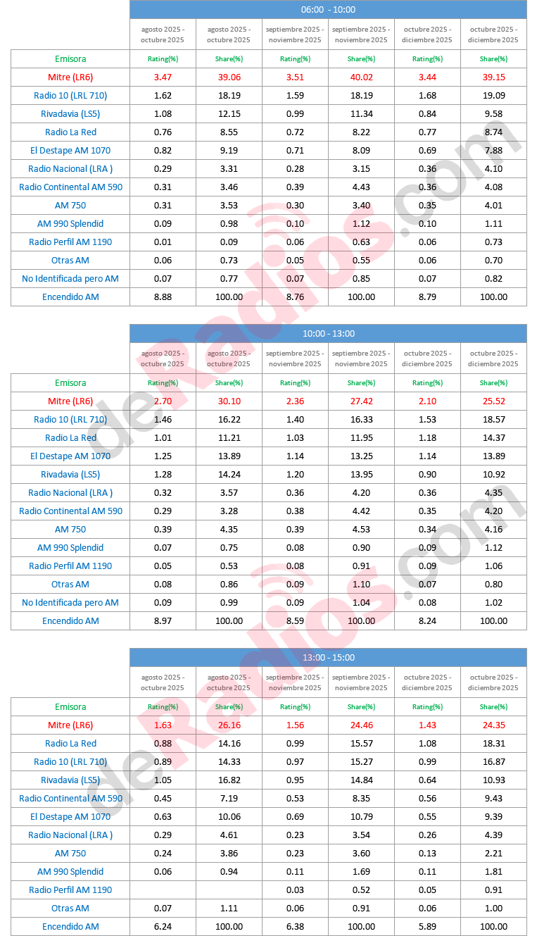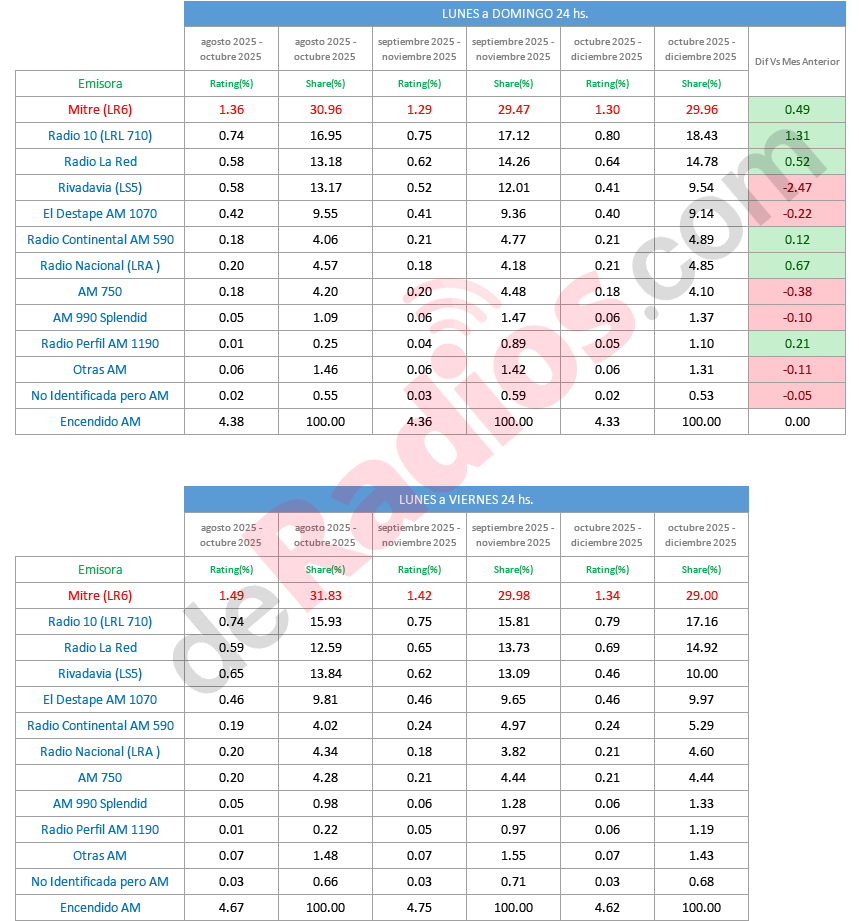En lo que es AM, Radio Mitre terminó DICIEMBRE de lunes a domingo las 24 hs. con un 29,96% de share continuando el liderando en las mediciones de Kantar Ibope Media.