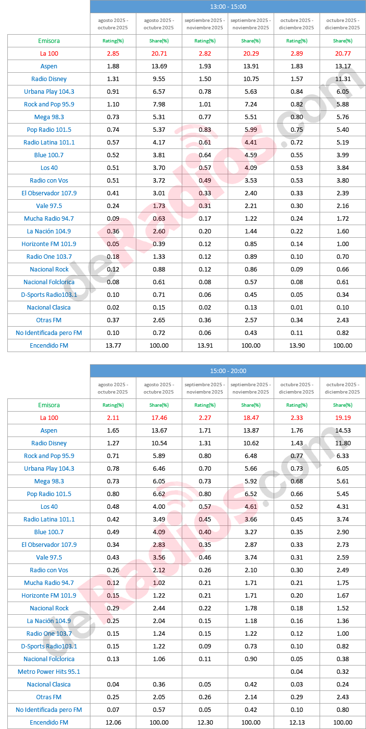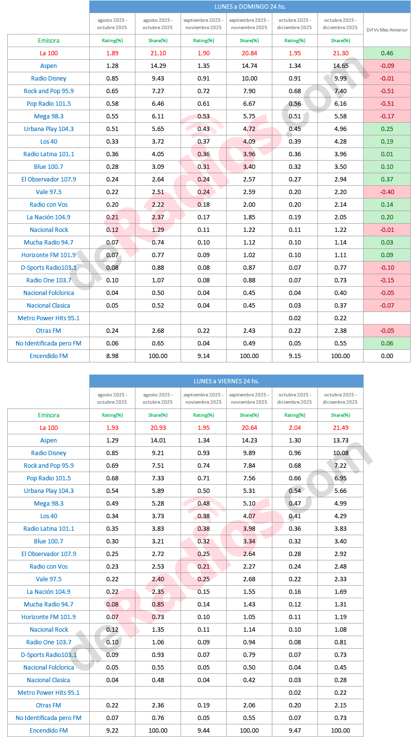 En tanto en las mediciones de van de lunes a viernes las 24 horas, La 100 continúa liderando con el 21,49 % de share.