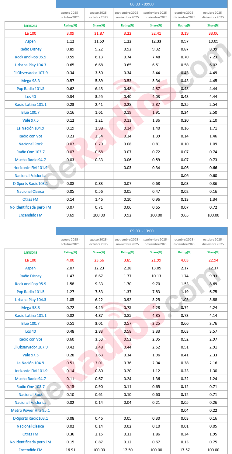 Kantar Ibope Media presentó las mediciones de DICIEMBRE 2025 y La 100 continúa liderando de lunes a domingo las 24 horas, con el 21,30%.