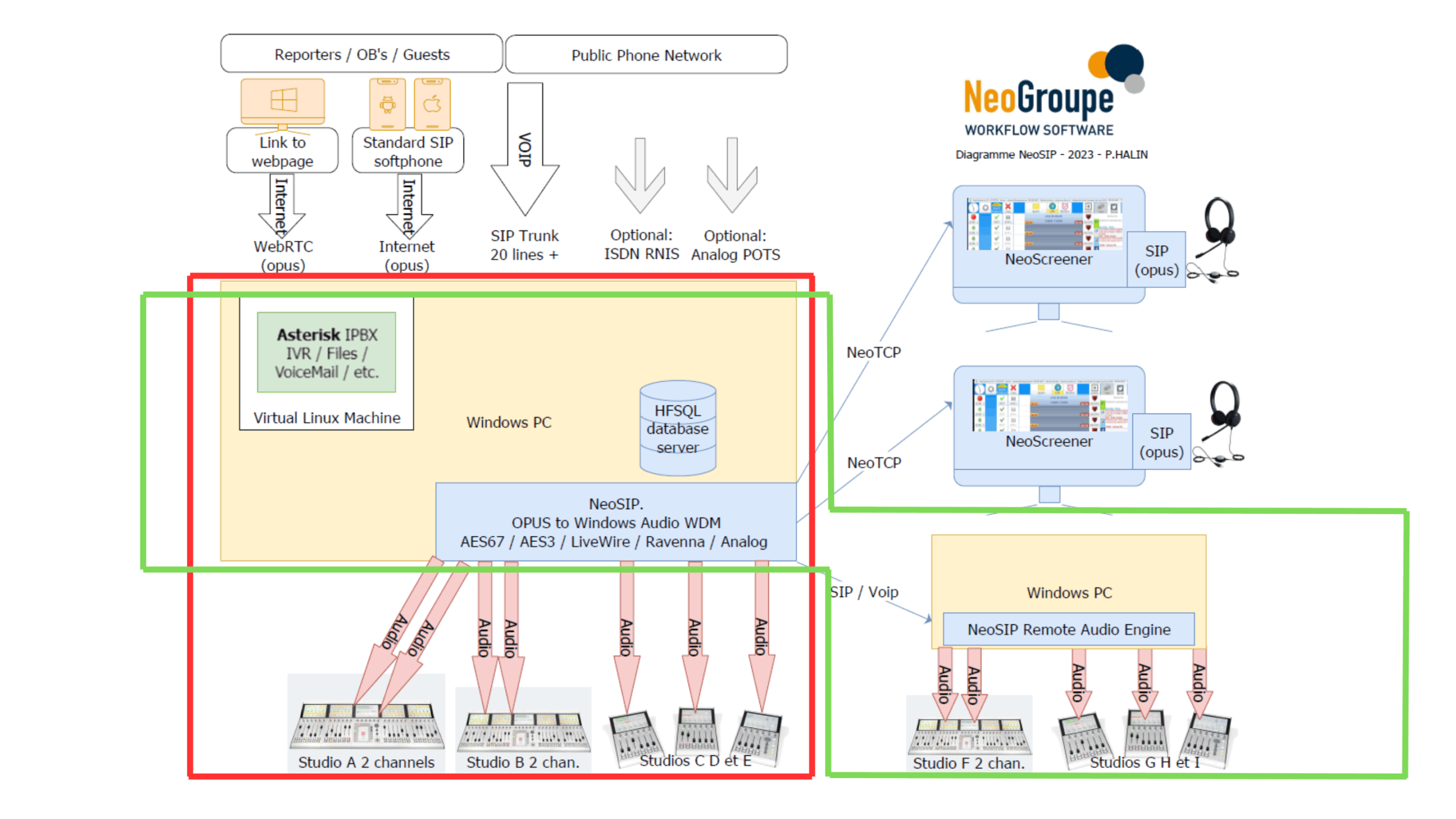NeoSIP es una solución de comunicación que sustituye a los híbridos tradicionales y a los sistemas multilínea, ofreciendo una interfaz unificada en NeoScreener (nuestro software de gestión de llamadas, la interfaz del presentador) para gestionar de forma transparente las llamadas procedentes del exterior y las contribuciones.