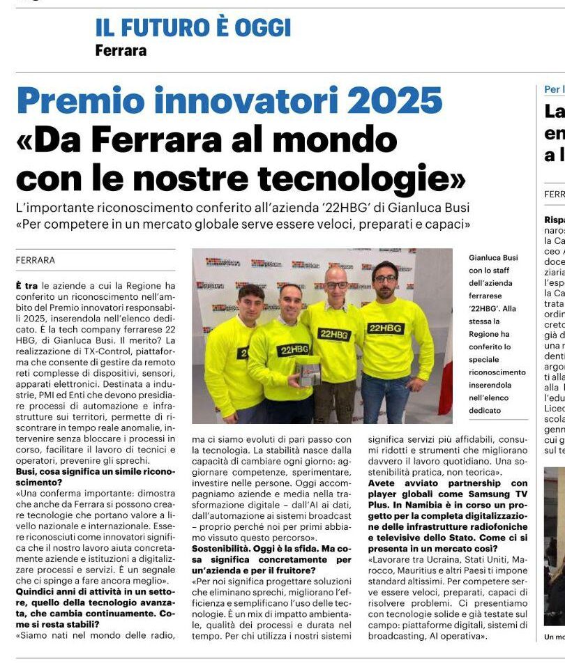 La empresa tecnológica italiana 22HBG ha recibido el “Premio Innovadores 2025” por TX-Control, una plataforma avanzada para la supervisión y gestión remota de infraestructuras broadcast.